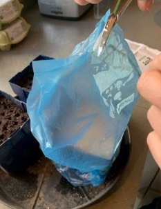 Maak kleine gaatjes in het potjes en leg in elk ‘gaatje’ een zaadje. Je kan er ook twee zaadjes inleggen en uitdunnen als ze allebei opkomen. Dek af met wat zand of vermiculiet en geef wat water. Om te zorgen dat het warm en vochtig blijft kan je een plastic zakje over het potje doen. Sluit af met een elastiekje om het potje. Maak bovenin wel een gaatje voor het toelaten van ventilatie. Houd de potjes in de vensterbank (op het zuiden) lekker warm. Zorg wel dat ze vochtig blijven door vanonder water te geven. De zaadjes zullen na een week of twee/drie gaan kiemen.Als de plantjes eenmaal zijn opgekomen en goed gaan