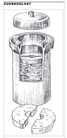 Doorsnede met inkijk in een zuurkoolvat. De steen is in twee halve ronden gedeeld. Zo kan het door de opening van het vat. De stenen drukken op de kool.