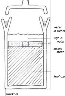 Het water in de richel van het vat zorgt voor een luchtdichte afsluiting. Gas dat door het fermentatieproces vrijkomt kan er echter wel uit. Dit noem je een waterslot.