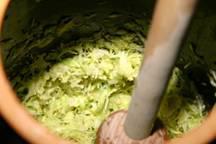 Gemengd met zout wordt de geschaafde kool in het zuurkoolvat gestampt. Dit kun je het beste portie voor portie doen en dan de gestampte kool even in een aparte bak "parkeren". De kool laat vocht los, zo veel dat het vocht boven de kool uit komt. En dat is goed.
