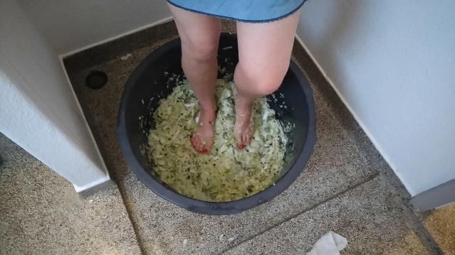 Met blote voeten de kool fijn trappelen in een grote speciekuip. Het leukste klusje van het zuurkool maken! Ik heb hier de weckpan ook wel eens voor gebruikt, maar dat was toch wel krappe voetenwerk. Ook hier geldt dat je het zout tijdens het trappelen toevoegt en dat er veel vocht uit de kool vrijkomt.