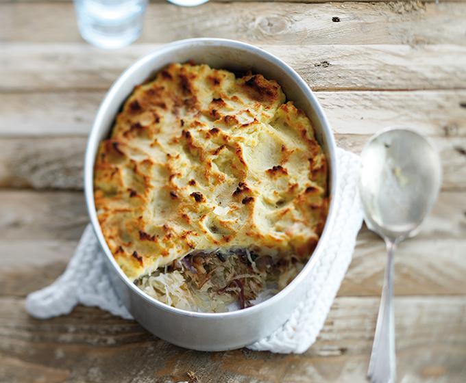 4. Verdeel de puree erover en bestrooi met paneermeel en geraspte kaas. Zet de schaal 10 minuten in de oven.
